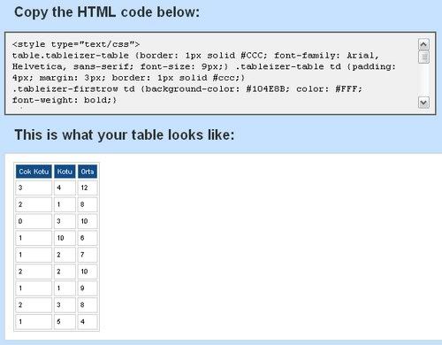 bu şekilde excel’den hücreler seçip kopyalayarak http://tableizer.journalistopia.com ‘daki gerekli kısma yapıştırıyor ve Tableize It! butonuna tıklıyoruz.